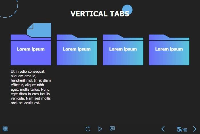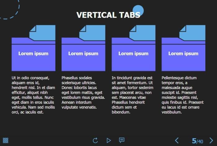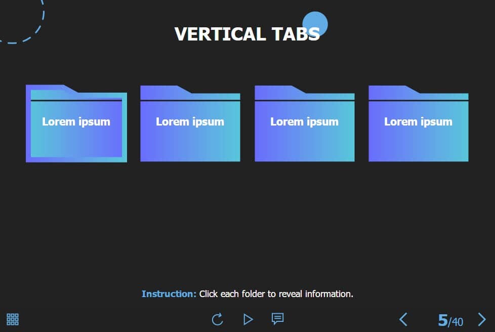 Folder Buttons — Storyline 3 / 360 Template. The eLearning interaction slide would become a great addition for your eCourse. It contains 4 clickable objects designed as folders. The user must click on each of them to reveal the additional information. The template is compatible with Storyline 3 / 360 software. All you need is just to paste the template into your project and to fill it with own learning materials. Try to create better courses with our amazing Articulate Storyline templates!