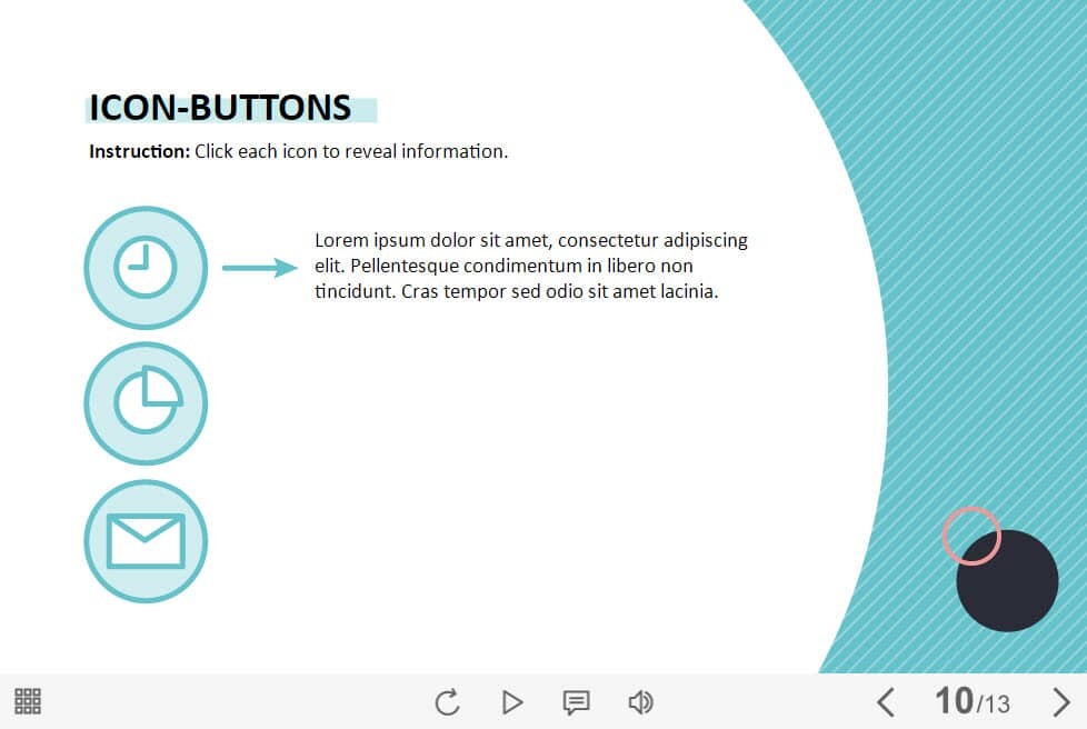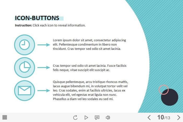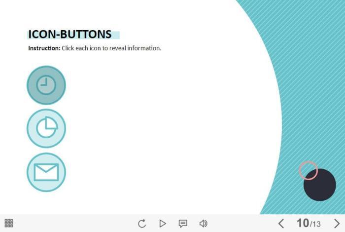 Clickable Icons — Storyline 3 / 360 Template. The eLearning interaction slide would become a great addition for your eCourse. It contains 3 clickable objects. The user must click on each of them to reveal the additional information. The template is compatible with Storyline 3 / 360 software. All you need is just to paste the template into your project and to fill it with own learning materials. Try to create better courses with our amazing Articulate Storyline templates!