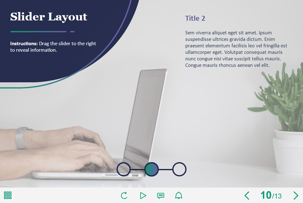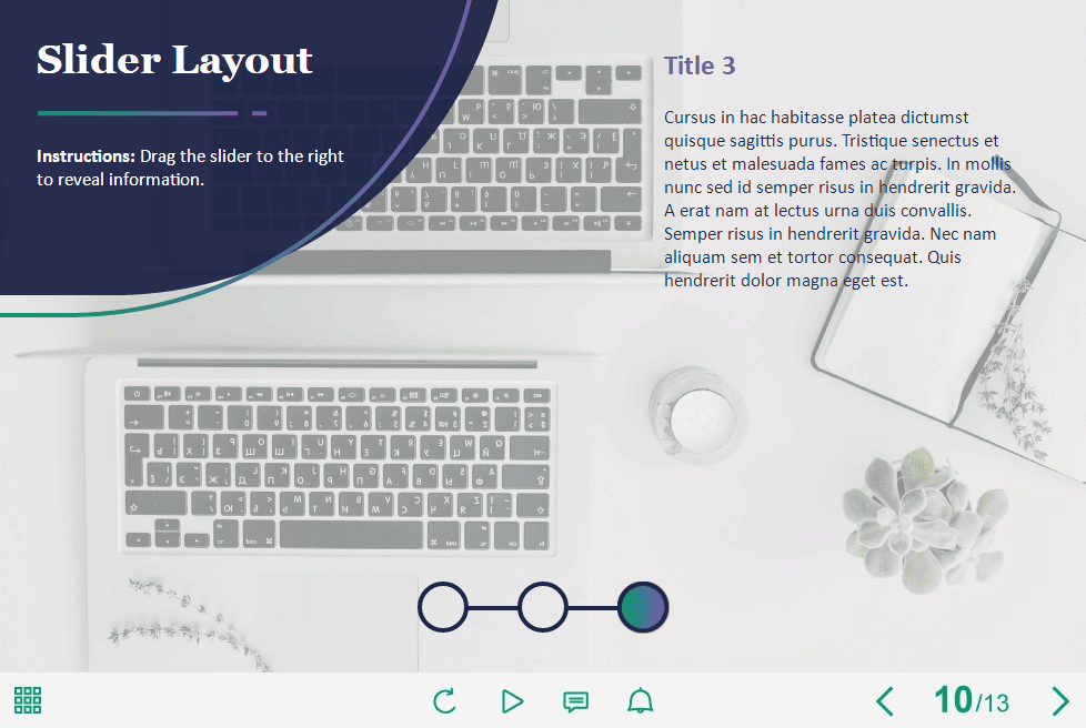 Horizontal Slider — Storyline 3 / 360 Template. The eLearning interaction slide would become a great addition for your eCourse. It contains a 3-position slider. The user must drag the slider to each next position to reveal the additional information. The template is compatible with Storyline 3 / 360 software. All you need is just to paste the template into your project and to fill it with own learning materials. Try to create better courses with our amazing Articulate Storyline templates!