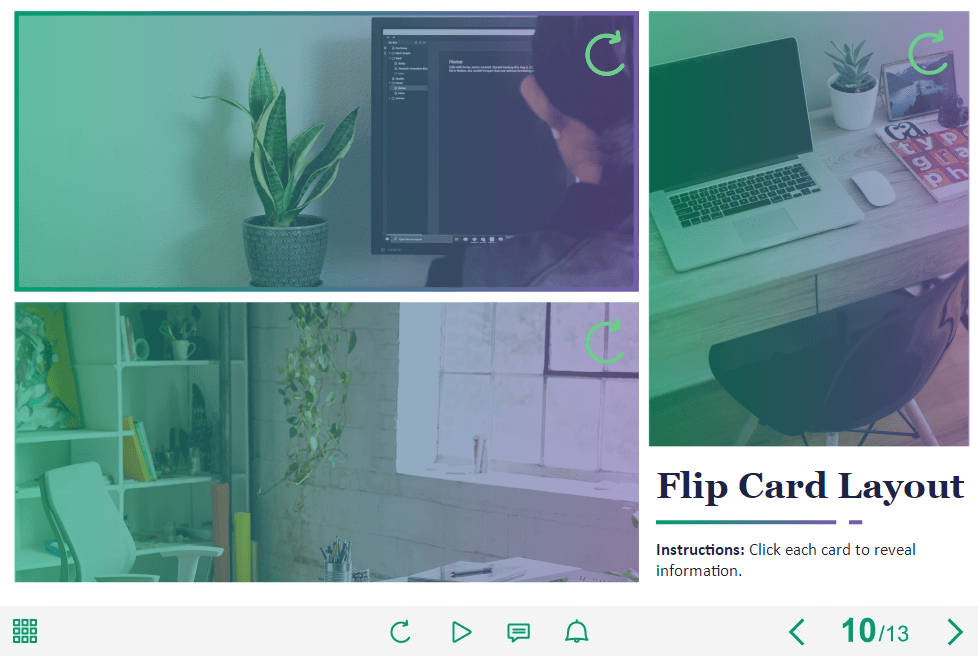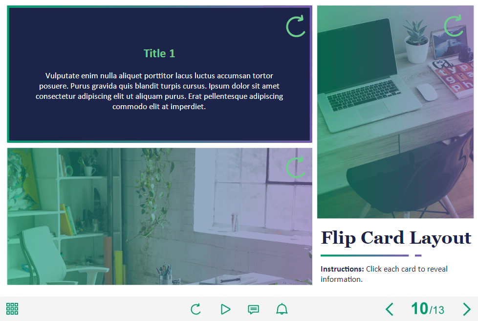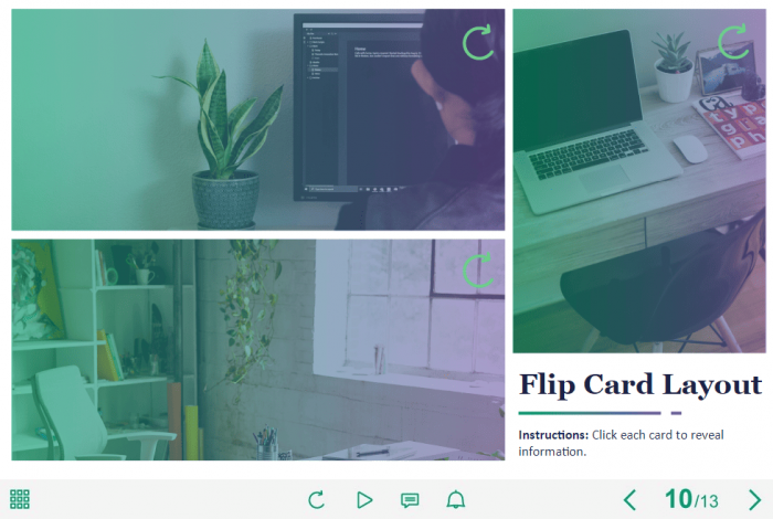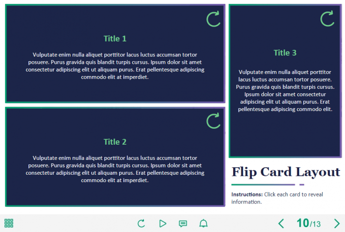 Flip Cards — Storyline 3 / 360 Template. The eLearning interaction slide would become a great addition for your eCourse. It contains three clickable flip cards. The user must click on each of them to reveal the additional information. The template is compatible with Storyline 3 / 360 software. All you need is just to paste the template into your project and to fill it with own learning materials. Try to create better courses with our amazing Articulate Storyline templates!