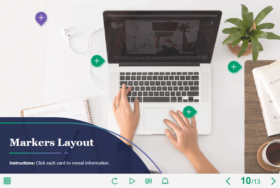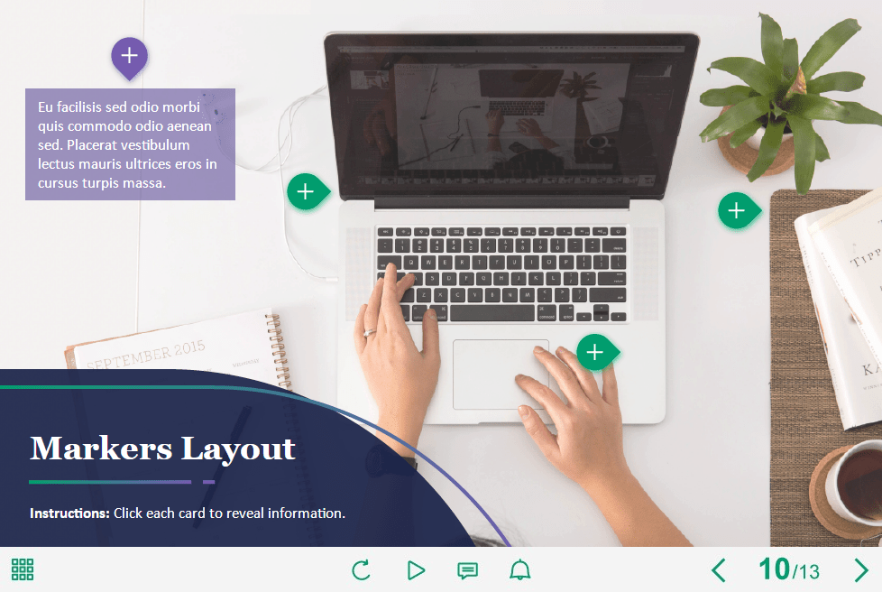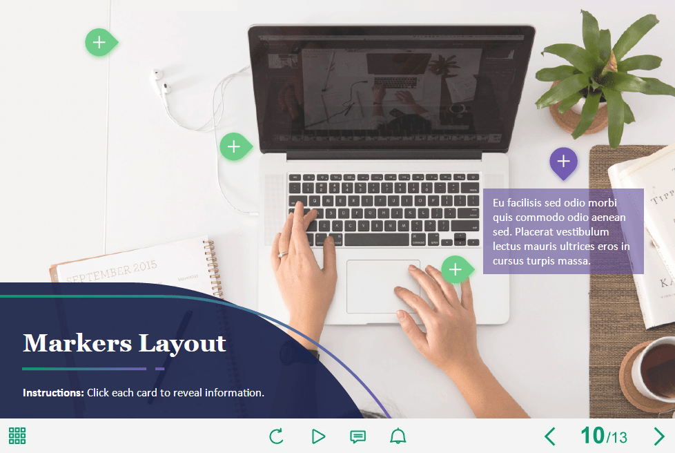 Markers — Storyline 3 / 360 Template. The eLearning interaction slide would become a great addition for your eCourse. It contains four clickable markers. The user must click on each of them to reveal the additional information. The template is compatible with Storyline 3 / 360 software. All you need is just to paste the template into your project and to fill it with own learning materials. Try to create better courses with our amazing Articulate Storyline templates!