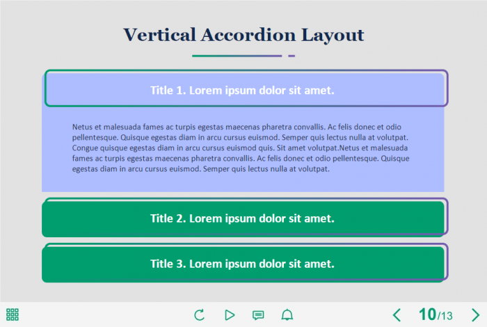 Vertical Accordion — Storyline 3 / 360 Template. The eLearning interaction slide would become a great addition for your eCourse. It contains a 3-tabbed vertical accordion. The user must click on each tab to reveal the additional information. The template is compatible with Storyline 3 / 360 software. All you need is just to paste the template into your project and to fill it with own learning materials. Try to create better courses with our amazing Articulate Storyline templates!
