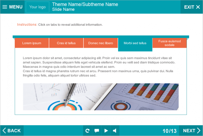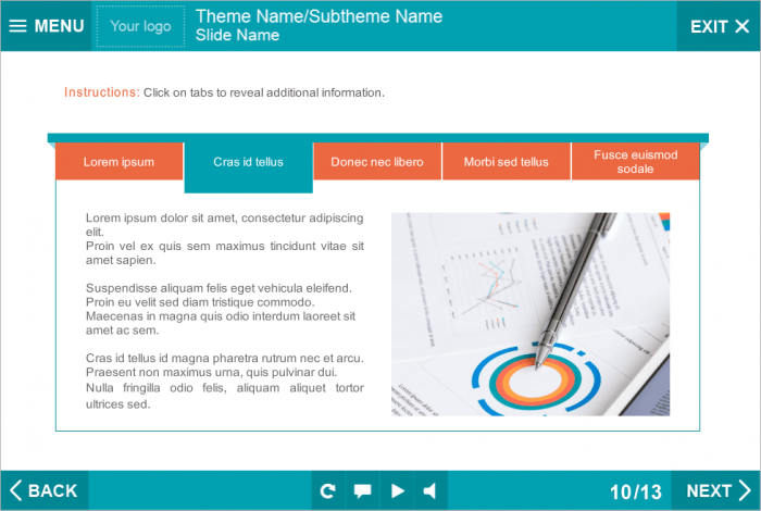 Storyline Bondi Blue Horizontal Tabs Template. It includes a horizontal unit, which consists of 5 rectangular tabs. An additional information appears when you click on each tab. Storyline Template based on Articulate Storyline 2 Software. It is a ready-to-use product, which is compatible with any Storyline Player Skin you like. You can create an effective e-course with its help. Interaction perfectly runs on tablet and PC. Fully compatible with Articulate Storyline 3 and 360.