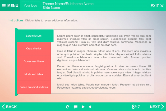 Storyline Green Vertical Tabs Template. It includes a vertical unit, which consists of 5 rectangular tabs. An additional information appears when you click on each tab. Storyline Template based on Articulate Storyline 2 Software. It is a ready-to-use product, which is compatible with any Storyline Player Skin you like. You can create an effective e-course with its help. Interaction perfectly runs on tablet and PC. Fully compatible with Articulate Storyline 3 and 360.