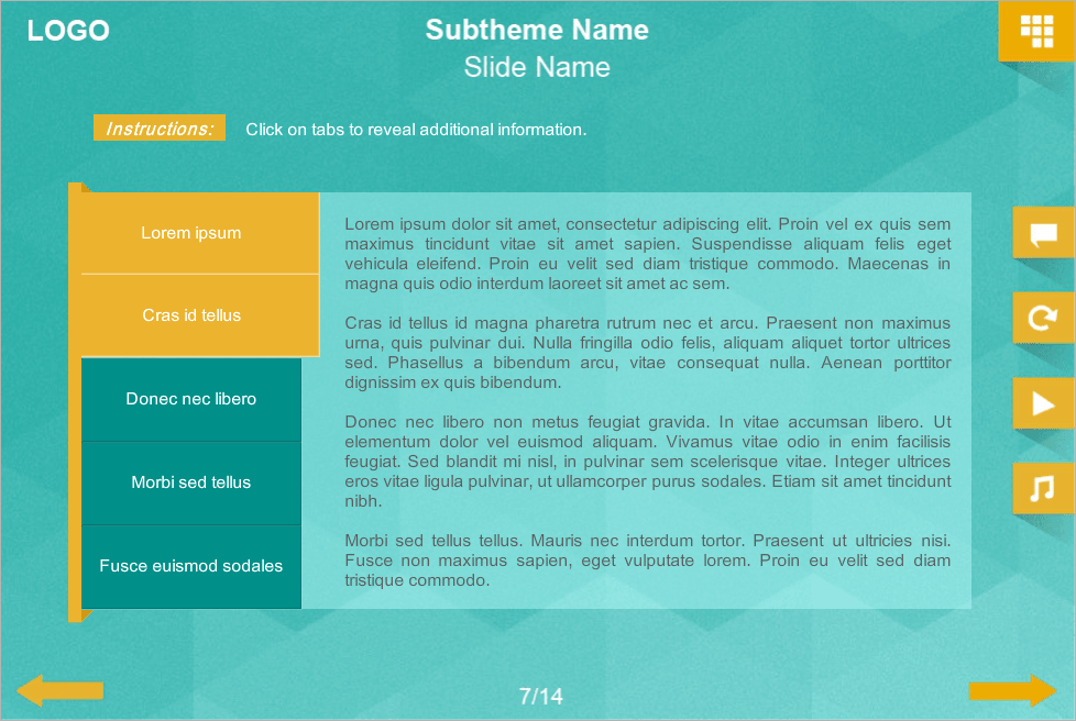 Storyline Vertical Tabs Template With Turquoise Fond. It includes a vertical unit, which consists of 5 rectangular tabs. An additional information appears when you click on each tab. Storyline Template based on Articulate Storyline 2 Software. It is a ready-to-use product, which is compatible with any Storyline Player Skin you like. You can create an effective e-course with its help. Interaction perfectly runs on tablet and PC. Fully compatible with Articulate Storyline 3 and 360.