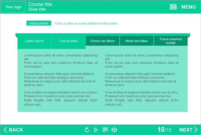 Storyline Caribbean Green Tabs Template. It includes a horizontal unit, which consists of 5 rectangular tabs. An additional information appears when you click on each tab. Storyline Template based on Articulate Storyline 2 Software. It is a ready-to-use product, which is compatible with any Storyline Player Skin you like. You can create an effective e-course with its help. Interaction perfectly runs on tablet and PC. Fully compatible with Articulate Storyline 3 and 360.