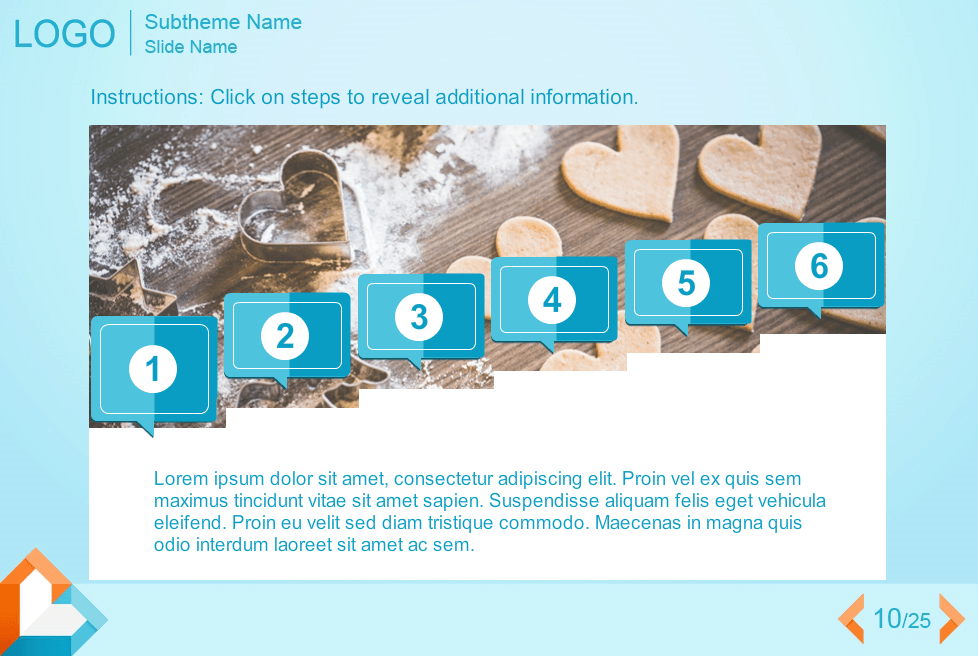 Storyline White Steps Template. It consists of six interactive blocks. Each of them contains additional information that displays in a special frame. Interactive slide is a ready-to-use product. Storyline Template based on Articulate Storyline 2 Software and is compatible with any Articulate Storyline Player Skin. Perfectly runs on PCs, tablets and mobile devices. It will be an excellent choice for your own e-learning project. Fully compatible with Articulate Storyline 3 and 360.