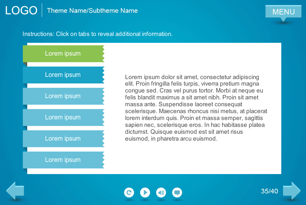 Storyline Blue Tabs Template. It consists of 6 interactive buttons. Each of them contains additional information that displays in a special frame. Info appears by clicking the buttons. Storyline Template is a ready-to-use product. It based on Articulate Storyline 2 software and is compatible with any Articulate Storyline Player Skin. Perfectly runs on PCs, tablets and mobile devices. It will be an excellent choice for your own e-learning project. Fully compatible with Articulate Storyline 3 and 360.