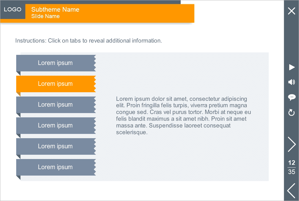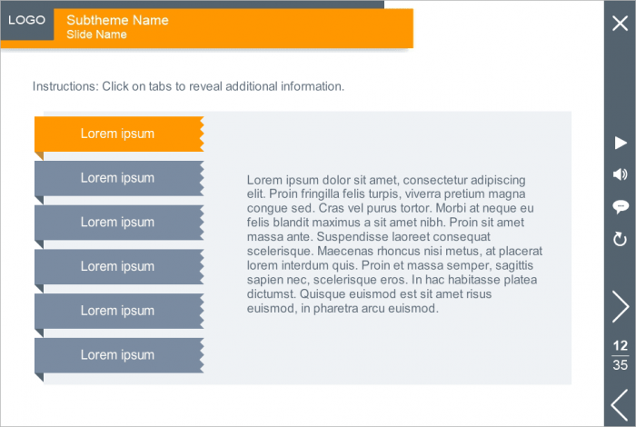 Storyline Rectangular Gray Tabs Template. It consists of 6 interactive buttons. Each of them contains additional information that displays in the center of the screen. Info appears by clicking the tabs. Storyline Template is a ready-to-use product. It based on Articulate Storyline 2 software and is compatible with any Articulate Storyline Player Skin. Perfectly runs on PCs, tablets and mobile devices. It will be an excellent choice for your own e-learning project. Fully compatible with Articulate Storyline 3 and 360. Storyline Templates allow you to create multifunctional e-learning courses without any efforts.