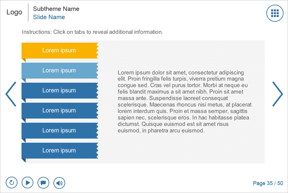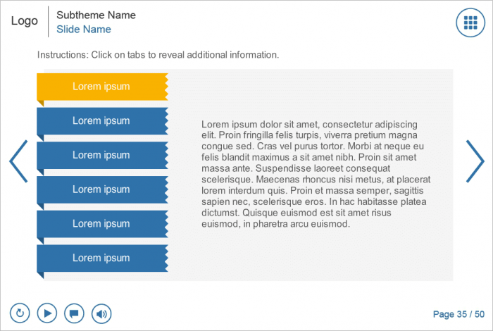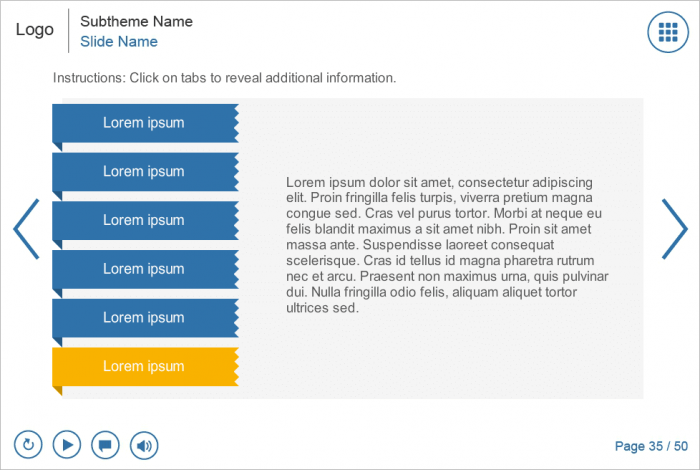 Storyline Vertical Tabs Template With White Background. Developed with Articulate Storyline 2 software and compatible with any Articulate Storyline Player Skin. Storyline Template contains 5 rectangular tabs, clicking on each of them leads to the showing the additional information. It can be used for creation of your own e-course. Perfectly runs on PC, tablet and mobile devices. Fully compatible with Articulate Storyline 3 and 360. Timeline interaction is already prepared for usage. Storyline Templates allow you to create multifunctional e-learning courses without any efforts.