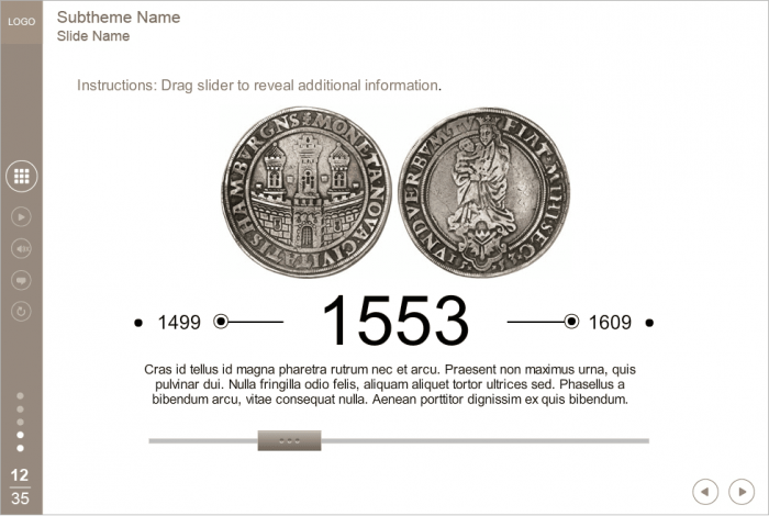 Storyline Slider Template. It consists of 5 different slides. Each of them contains additional information that displays in a special frame. Info appears by moving the slider. Storyline Template is a ready-to-use product. It based on Articulate Storyline 2 software and compatible with any Articulate Storyline Player Skin. Perfectly runs on PCs, tablets and mobile devices. Fully compatible with Articulate Storyline 3 and 360. It will be an excellent choice for your own e-learning project. Storyline Templates allow you to create multifunctional e-learning courses without any efforts.