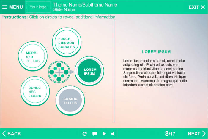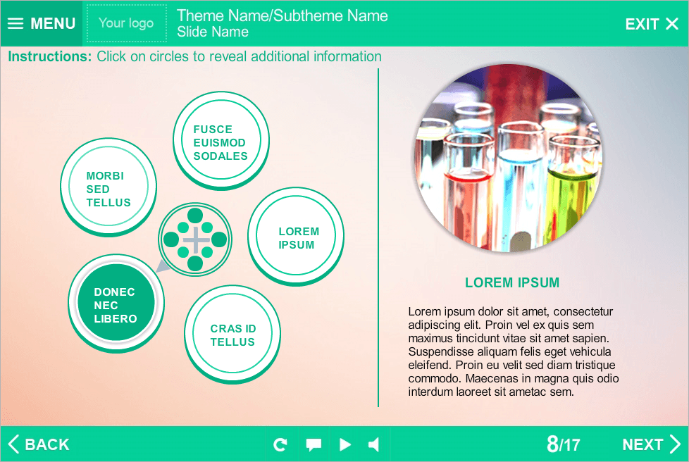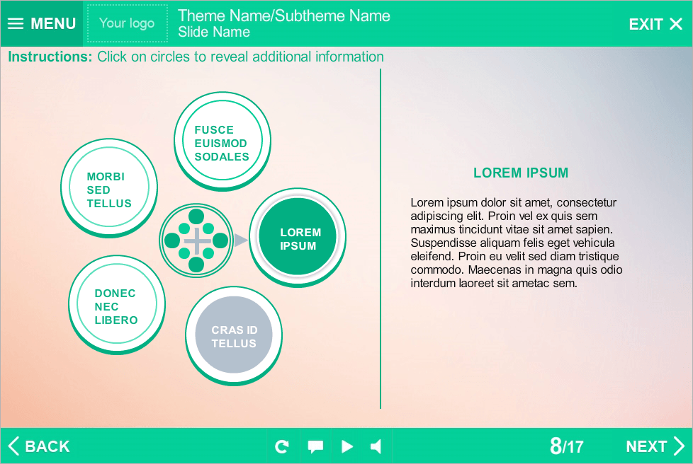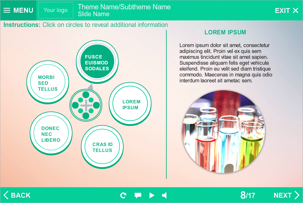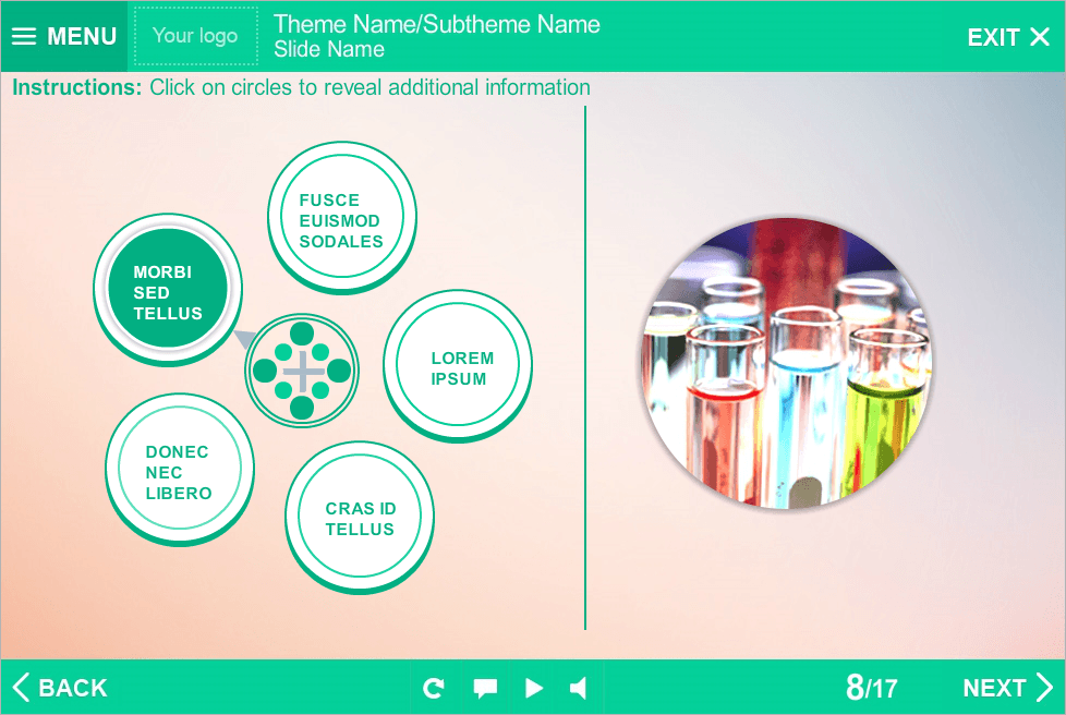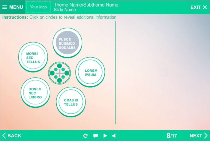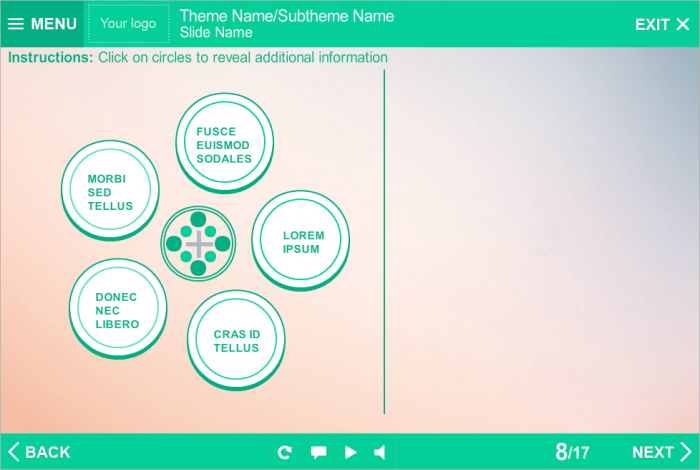 Storyline Tabs Template With Round Buttons. It consists of 5 clickable buttons. Clicking on each of them opens additional information that displays in a right part of screen. Storyline Template is a ready-to-use product. It based on Articulate Storyline 2 software and compatible with any Articulate Storyline Player Skin. Perfectly runs on PCs, tablets and mobile devices. It will be an excellent choice for your own e-learning project. Fully compatible with Articulate Storyline 3 and 360. Storyline Templates allow you to create multifunctional e-learning courses without any efforts.