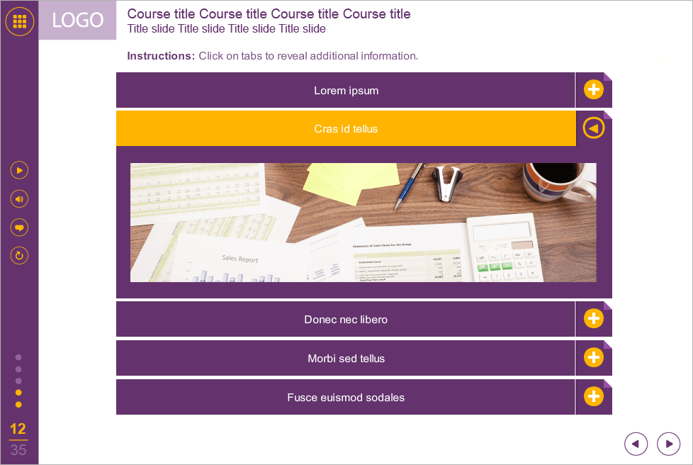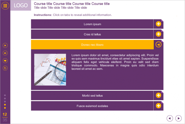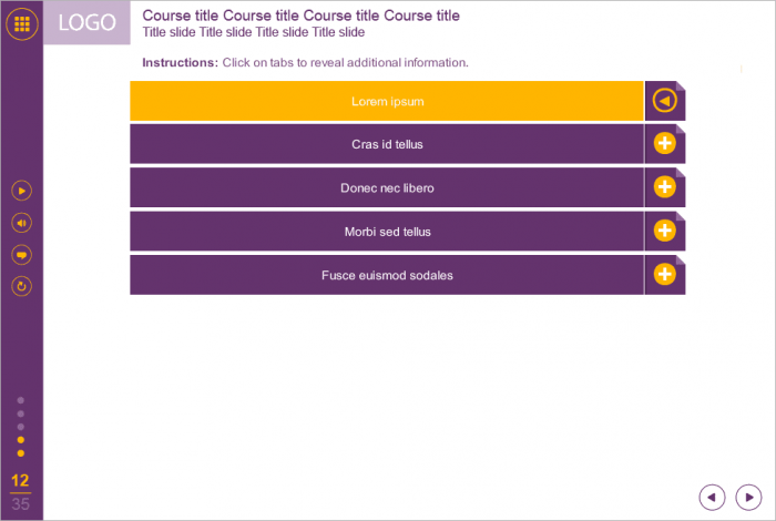 Storyline Vertical Accordion Template. Storyline Template is based on Articulate Storyline 2. Designed for showing any type of information in visual blocks. Consist of 5 interactive vertical slides, intended to reveal additional info. Perfectly runs on both Tablet and PC. Could be easily added to any type of Articulate Storyline Player Skins to create an effective e-learning courses. It’s already designed and prepared for usage. Fully compatible with Articulate Storyline 3 and 360. Storyline Templates are the ready-made products of the most popular online training software.