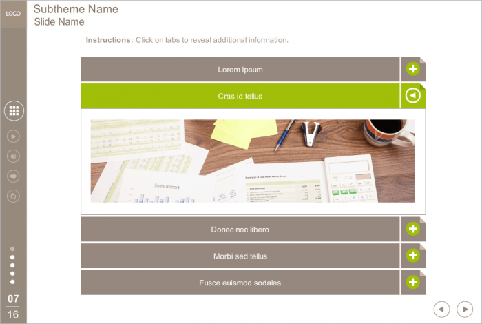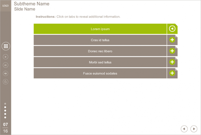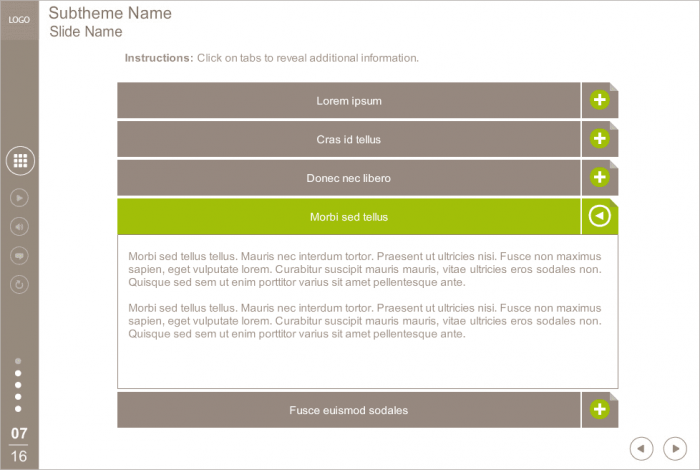 Storyline Accordion Template With Grey Blocks. Storyline Template is based on Articulate Storyline 2 software. It represents 5 clickable blocks, which display the additional information. This interaction is compatible with Articulate Storyline Player Skins. It can be used for creating your own effective e-course. Interactive slide is a ready-to-use product. Can be launched on PCs and tablets. Fully compatible with Articulate Storyline 3 and 360. Storyline Templates are the ready-made products of the most popular online training software.