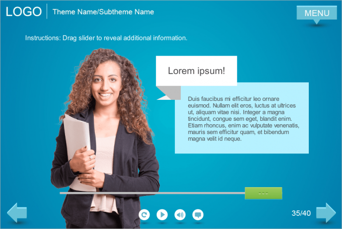 Storyline Dialogue Template. Storyline Template is based on Articulate Storyline 2. Designed for showing any type of information in slides that look like dialogues. Consist of 5 interactive slides, intended to reveal additional info. Perfectly runs on both Tablet and PC. Could be easily added to any type of Articulate Storyline Player Skins to create an effective e-learning courses. It’s already designed and prepared for usage. Fully compatible with Articulate Storyline 3 and 360. Storyline Templates are the ready-made products of the most popular online training software.