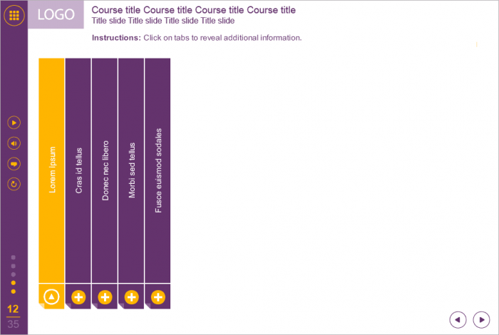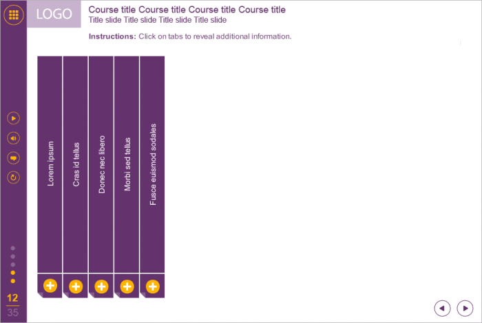 Storyline Purple Accordion Template. It consists of 5 clickable vertical blocks. Each of them contains additional information that displays in a special frame. Storyline Template is a ready-to-use product. It based on Articulate Storyline 2 software and compatible with any Articulate Storyline Player Skin. Perfectly runs on PCs, tablets and mobile devices. It will be an excellent choice for your own e-learning project. Fully compatible with Articulate Storyline 3 and 360. Storyline Templates are the ready-made products of the most popular online training software.