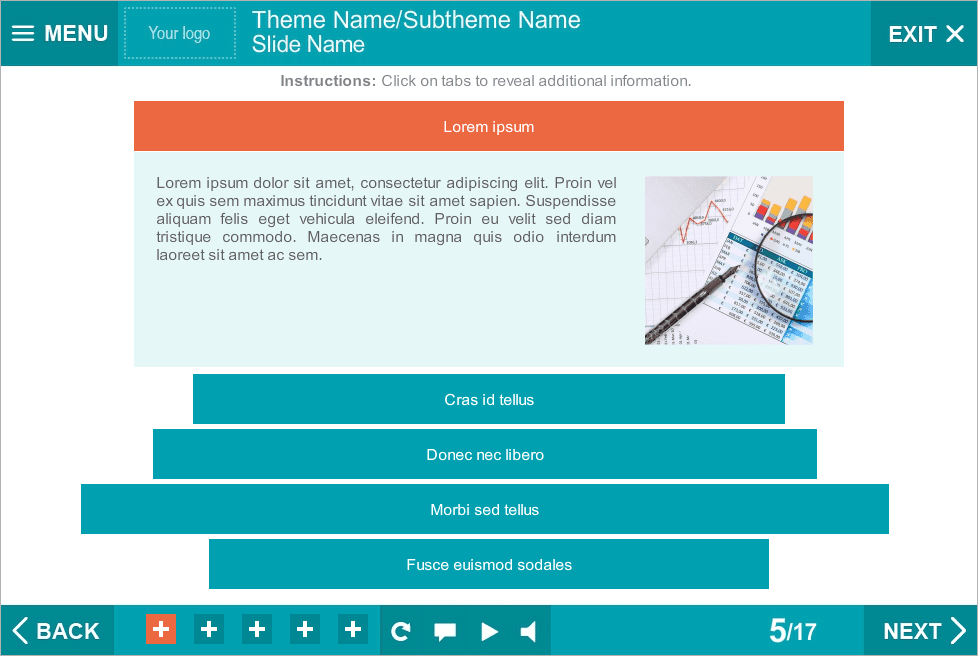 Storyline Turquoise Vertical Accordion Template. Developed with Articulate Storyline 2 software and compatible with any Articulate Storyline Player Skin. Storyline Template contains 5 horizontal blocks. Clicking on each of them leads to the showing an additional information. All blocks have different length. It can be used for creation of your own elearning courses. Perfectly runs on PCs, tablets and mobile devices. Fully compatible with Articulate Storyline 3 and 360. Ready-made Storyline Templates allow creating unique elearning courses with extensive functionality.