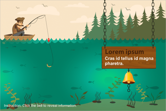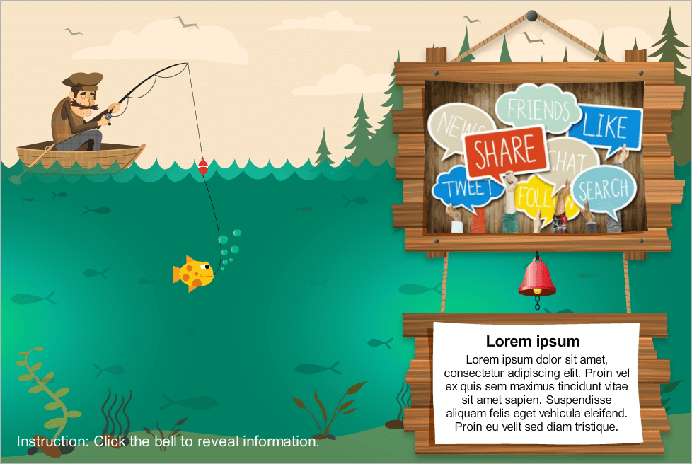 Storyline Fishing Template is a gamified template based on Articulate Storyline 2 software. Its distinctive feature is a creative design solution: to reveal graphical and textual information you should click the bell to lure a fish. This Storyline Template would be a great choice for a creative elearning project. Already designed and prepared for usage. Perfectly runs on both PC and tablet. Interaction is compatible with any type of Articulate Storyline Course Player.