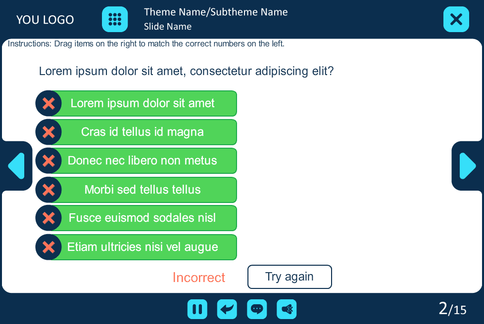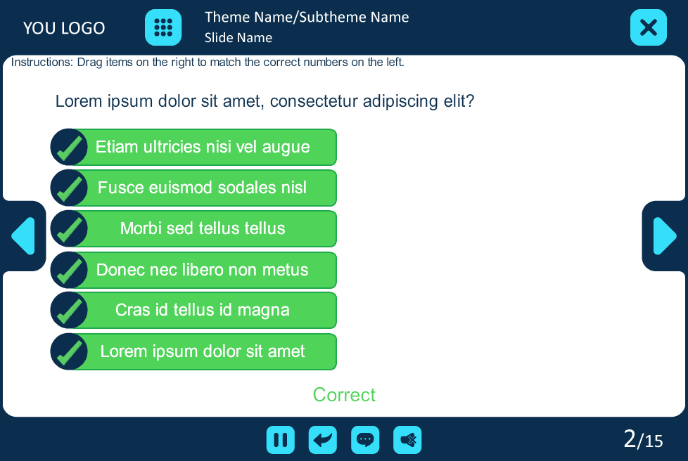 Storyline Drag And Drop Template is a gamified template based on Articulate Storyline 2. Designed in white, blue and green colours. The distinctive feature of the interaction is a creative design solution: you should drag items on the right to match the correct numbers on the left. This Storyline Template would be a great choice for those who wish to add some gamification elements into the e-course. Already designed and prepared for usage. Can be launched on both PC and tablet. Interaction is compatible with any type of Articulate Storyline Course Player.