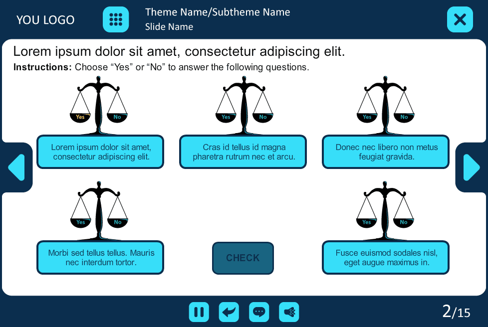 Storyline Cheking Questions Template based on Articulate Storyline 2 software. Designed in white, light blue and dark blue colours. It includes 5 questions, each of them requires the “yes” or “no” answer. This Storyline Template would be an excellent choice to check learner’s knowledge. Already designed and prepared for usage. Can be launched on both PC and tablet. Interaction is compatible with any type of Articulate Storyline Course Player.
