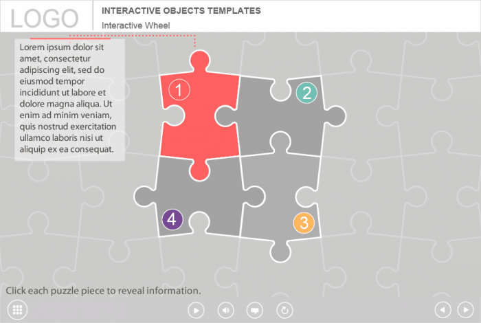 Storyline Puzzle Pieces Template. It is the unique template based on Articulate Storyline 2 software. The template consists of 4 clickable buttons designed in the form of puzzle pieces. Each piece of a puzzle has its own number and contains the additional text information. It displays in the corner of the screen after clicking on a puzzle piece. The interaction can be used for creating your own effective e-learning course. It is compatible with any type of Articulate Storyline Course Player. Already designed and prepared for usage.