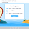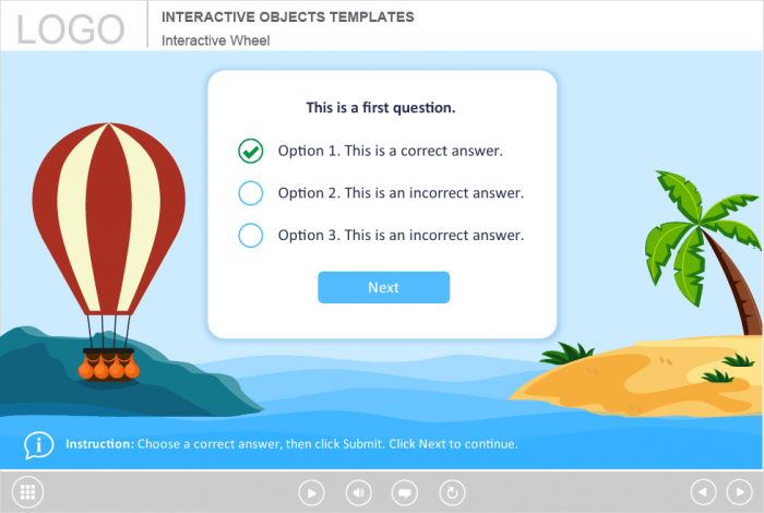 Balloon Flight — Storyline Template. An interactive quiz is based on Articulate Storyline 2 and is compatible with any type of storyline templates. There are several answer options. User must choose the correct answer to complete the task and to transfer ballon from one shore to another. The storyline balloon flight quiz is made to simplify the work of elearning developers and to provide better mastering of elearning material. It could be easily inserted in any elearning project. Storyline Templates are one of the most popular solutions among elearning developers. Extensive functionality allows to create powerful elearning courses.