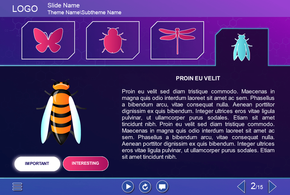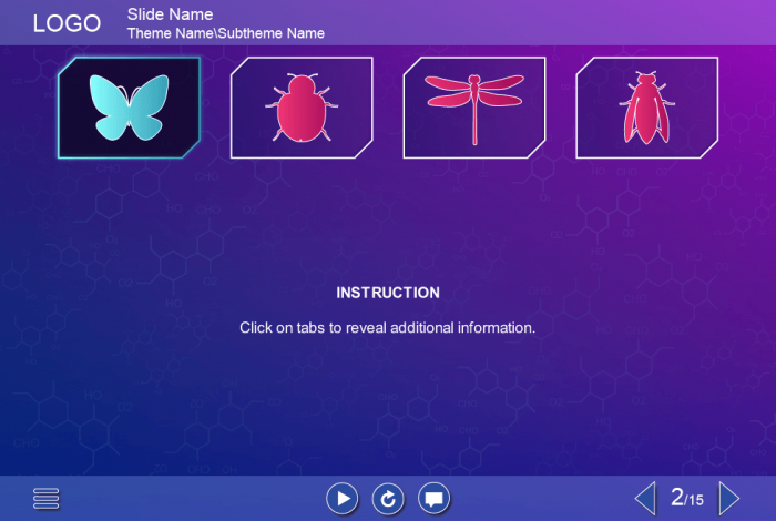 Storyline Tabs With Insects Template. The template consists of 4 clickable tabs with insects icons, and each tab includes two buttons. It will be an excellent choice for your own e-learning project. Based on Articulate Storyline 2 software and is compatible with any type of Articulate Storyline Course Player. The Storyline Template is a ready-to-use product that can be launched on both PC and tablet.