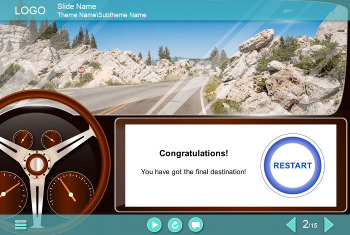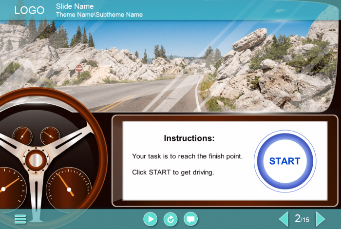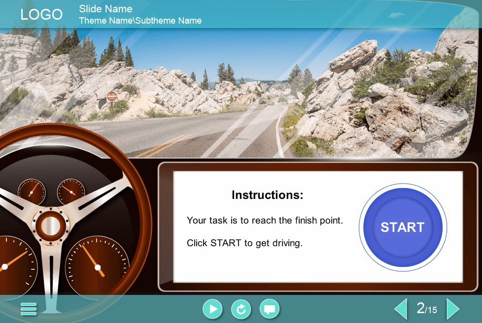 Storyline Driving The Car Template. This is the unique storyline template designed in the gamified form. The user’s task is to reach the finish point. He must click on “Start” and “Next” buttons to reveal the additional information. This template will be an excellent choice to grab learner’s attention and to improve the digestibility of course information. Based on Articulate Storyline 2 software and is compatible with any type of Articulate Storyline Course Player. The Storyline Template is a ready-to-use product that can be launched on both PC and tablet.