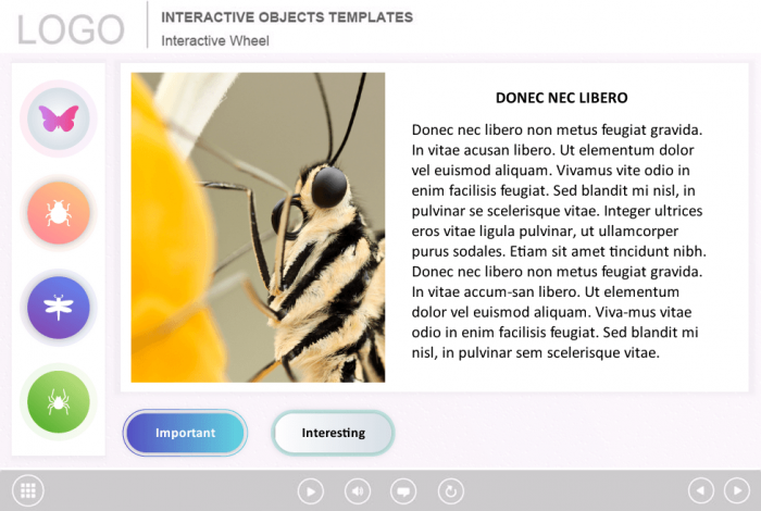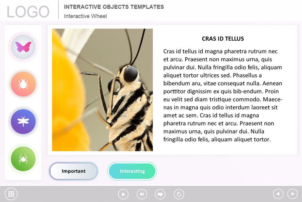 Storyline Vertical Tabs With Insects Template. The template consists of 4 clickable tabs with insects icons, and each tab includes two buttons. It will be an excellent choice for your own e-learning project. Based on Articulate Storyline 2 software and is compatible with any type of Articulate Storyline Course Player. The Storyline Template is a ready-to-use product that can be launched on both PC and tablet.