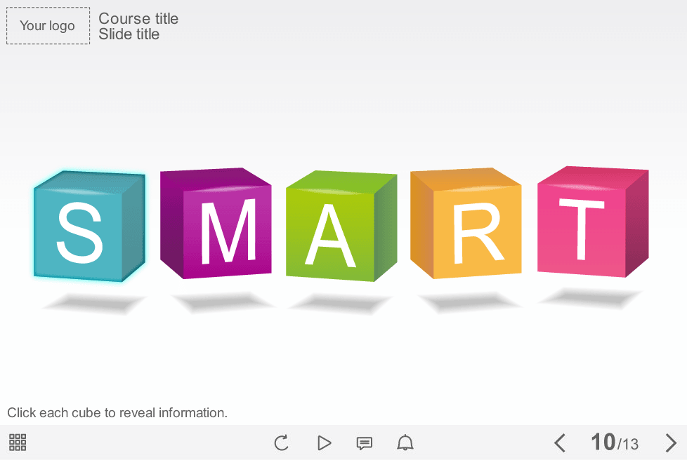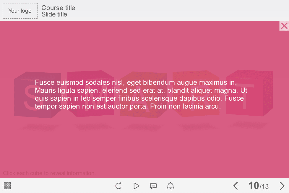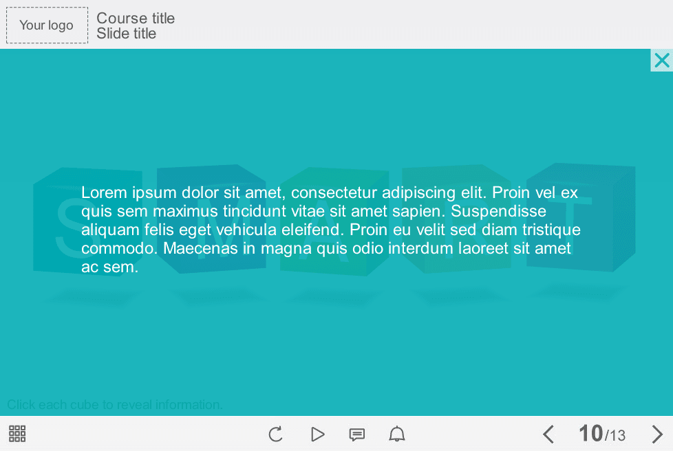 Storyline Clickable Cubes Template is based on Articulate Storyline 2 software. It contains 5 clickable colored cubes. The course information is represented in pop-up windows, each of them opens after clicking on any cube. This Storyline Template would be an excellent choice to create a powerful e-learning course. It is compatible with any type of Articulate Storyline Course Player. Can be launched on both PC and tablet.
