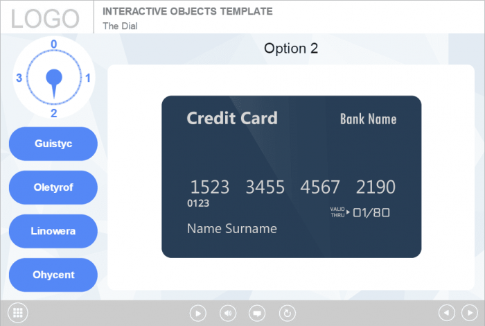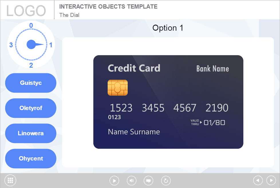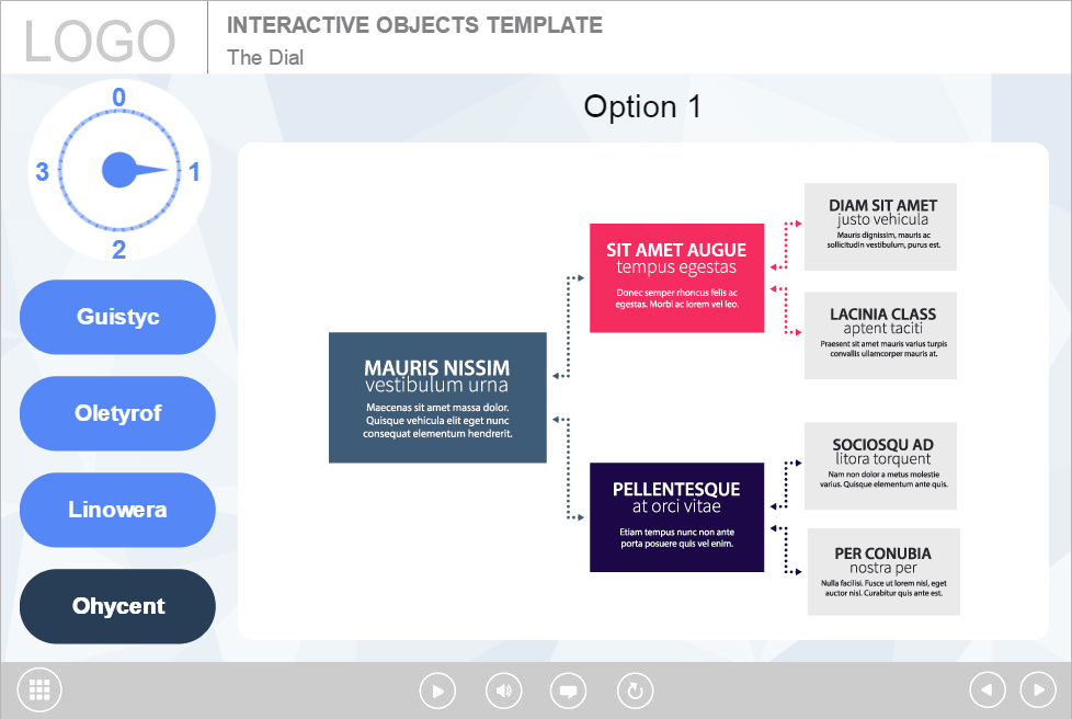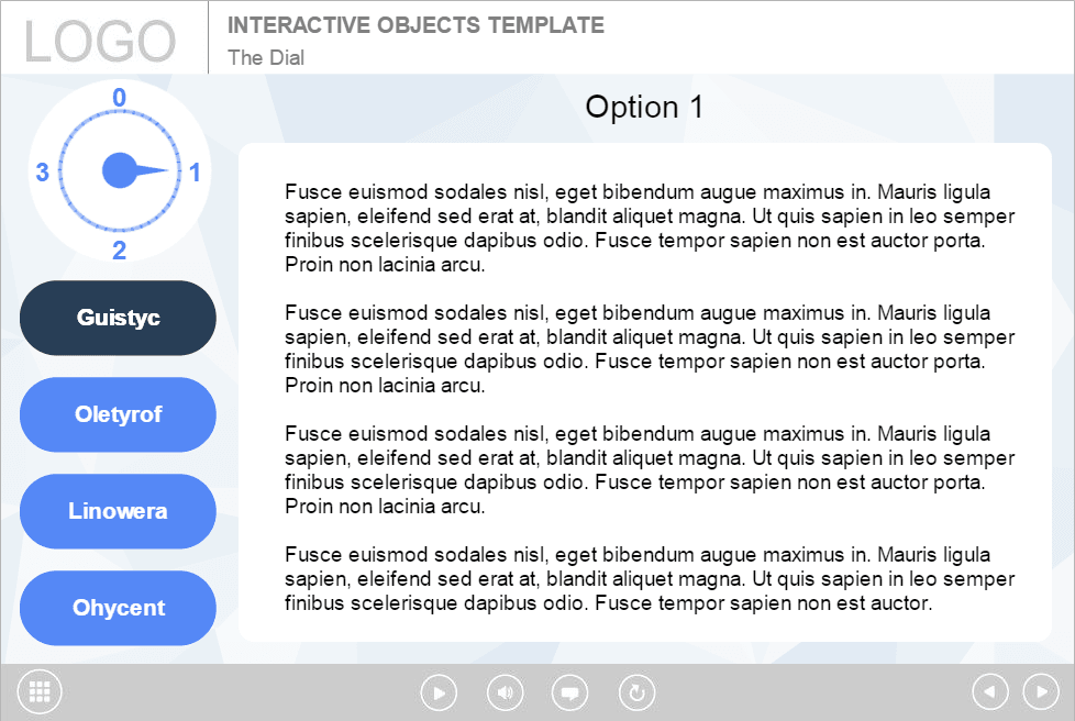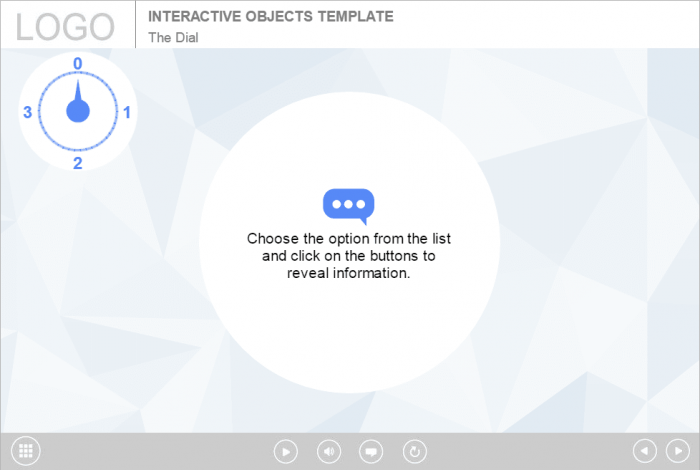 Storyline Simple Dial Handle Template. Based on Articulate Storyline 2 software. It contains a dial knob that has 4 positions. The user must turn the handle and click on each button to reveal the course information. This highly functional Storyline Template would be a great choice to create your own powerful elearning course. It’s compatible with any type of Articulate Storyline Course Player. The interaction is already designed and prepared for usage. Perfectly runs on both PC and tablet. Storyline templates are very popular tools among e-course developers. They offer a wide range of features that makes storyline templates unique and innovative.