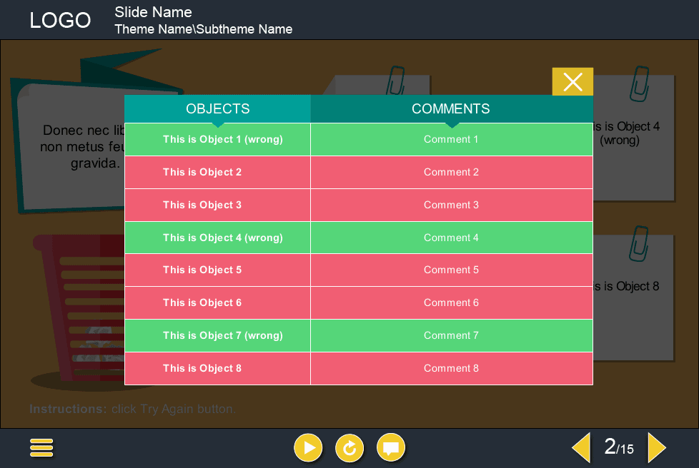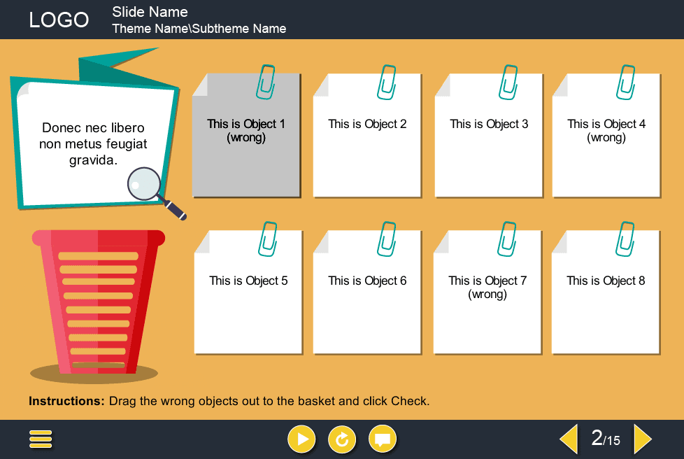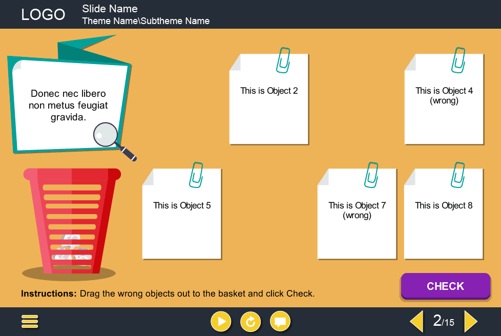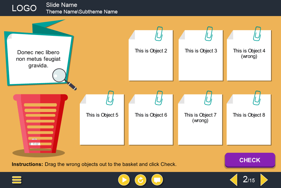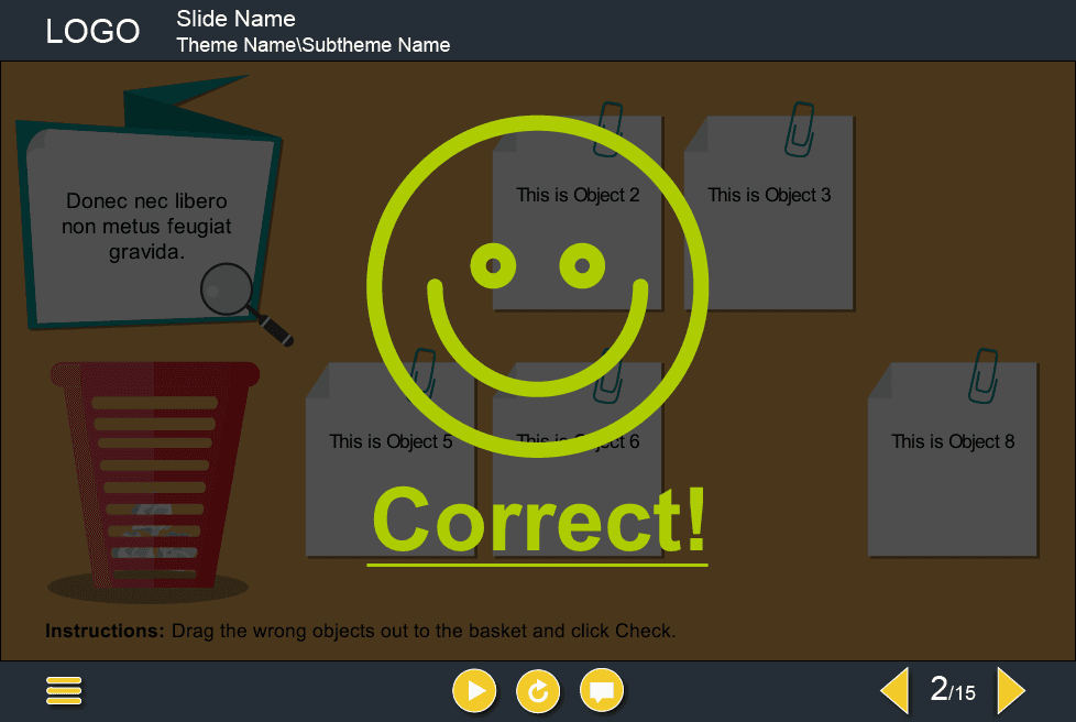Storyline Drag Out Wrong Objects Template. Based on Articulate Storyline 2 software. The template includes 8 draggable objects placed on a single slide. The user must determine the wrong ones among them and drag them out to the basket on the right side of the screen. After completing the test, user gets immediate feedback message with its results.