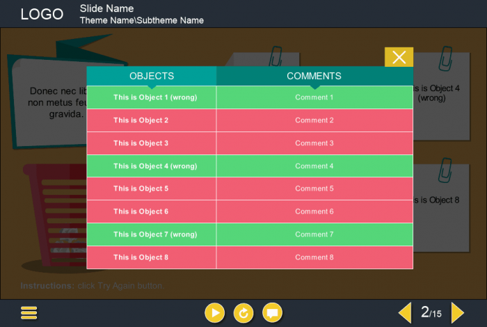 The drag-and-drop Storyline Template would be an excellent choice to check learner’s knowledge. It’s compatible with any type of Articulate Storyline Course Player. The template is already designed and prepared for usage. Perfectly runs on both PC and tablet. Storyline templates are very popular tools among e-course developers. They offer a wide range of features that makes storyline templates unique and innovative.