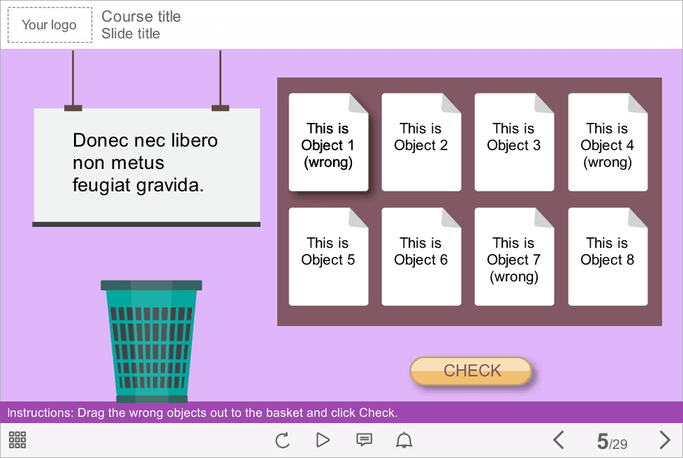 Storyline Dragging Wrong Objects Template. The template includes 8 draggable objects placed on a single slide. The user must determine the wrong items among them and drag them out to the basket. After completing the test, user gets immediate feedback message with its results.