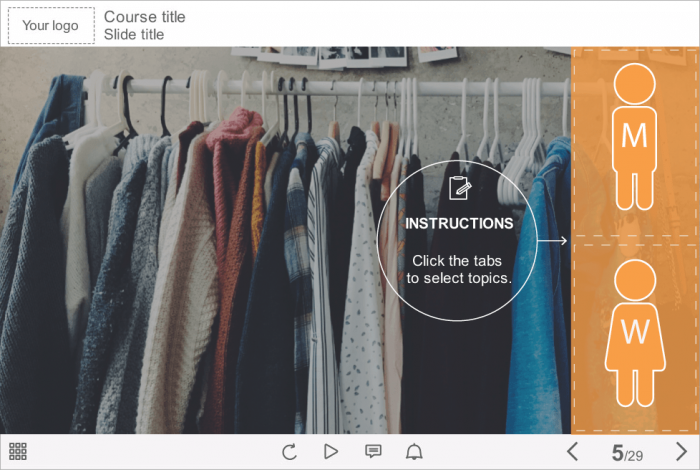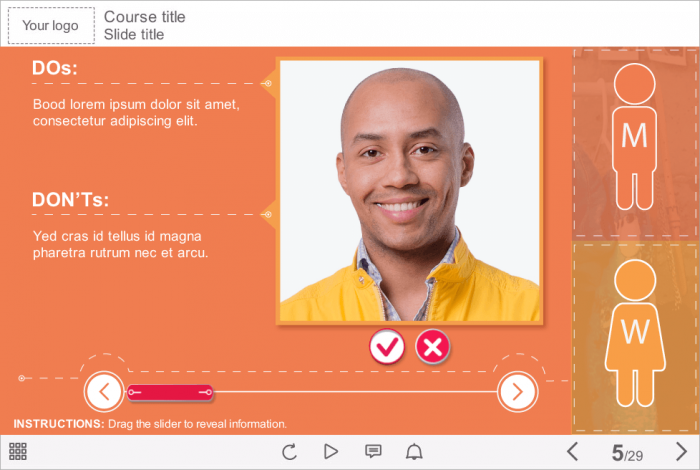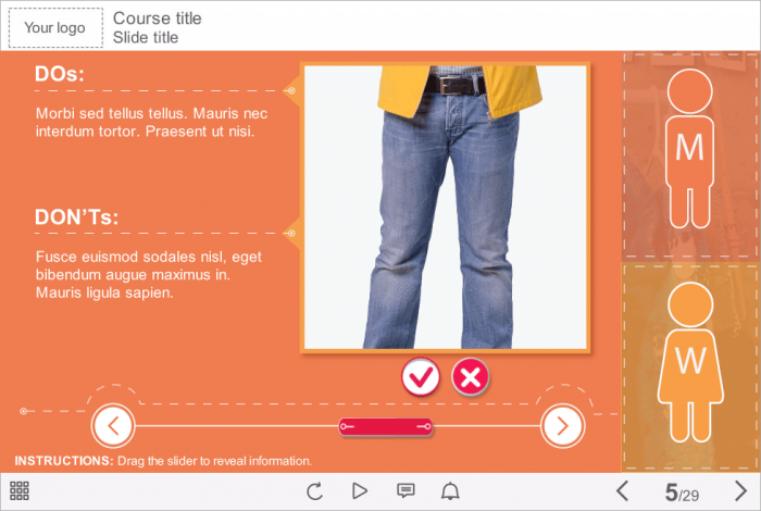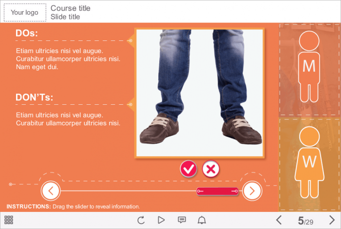 Storyline Do’s And Don’ts Template. It is an unique template based on Articulate Storyline 2 software. The interaction contains two tabs placed at the right part of the screen; each of them represents a slideshow with four slider positions. The user can view two options on each slide: the first one is represented as a correct, and the second one – as an incorrect. The photos of cutout characters dressed in business and casual style were used to better illustrate the main purpose of the interaction. This template would be an excellent choice to provide the course information in an easily perceivable form. Compatible with any type of Articulate Storyline Course Player. The Storyline Template is a ready-to-use product that can be launched on both PC and tablet.