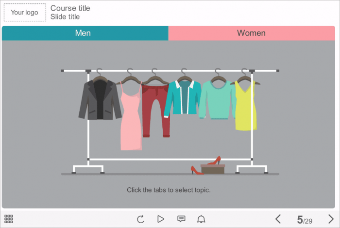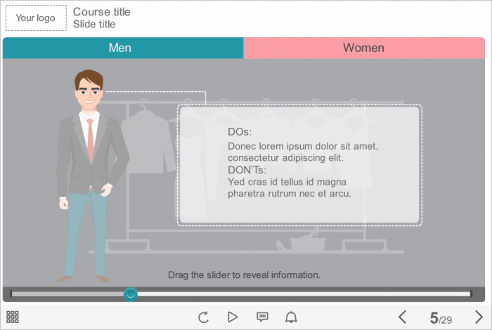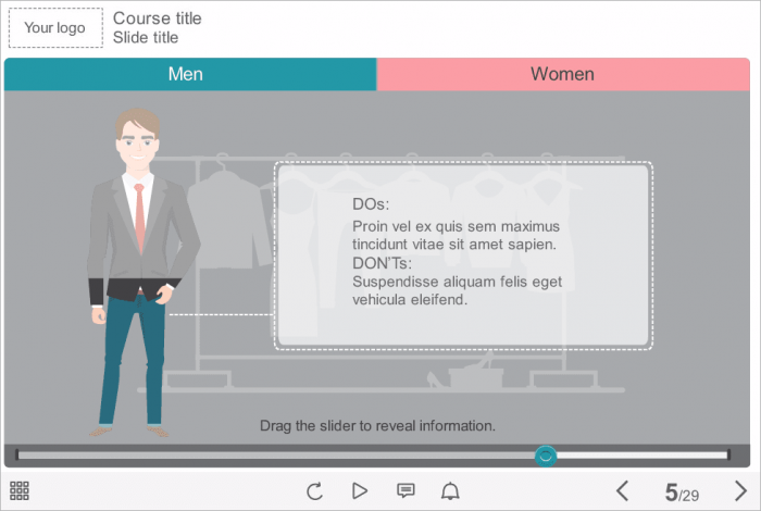 Storyline Two Tabs with Slideshows Template. It is an unique template based on Articulate Storyline 2 software. The interaction consists of two clickable tabs placed at the top of the screen; each of them contains a slideshow with five slider positions. The main idea of the interactive is to familiarize the user with the do’s and don’ts of the corporate clothing style. Male and female vector characters were used to provide the course information in a more perceptible form.