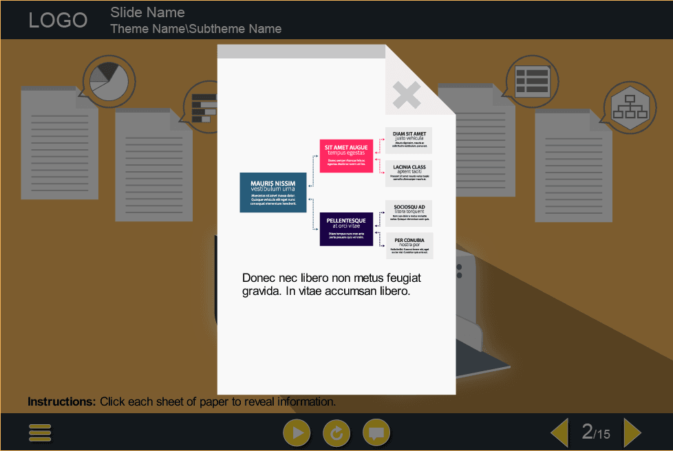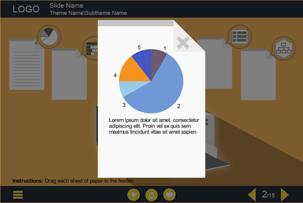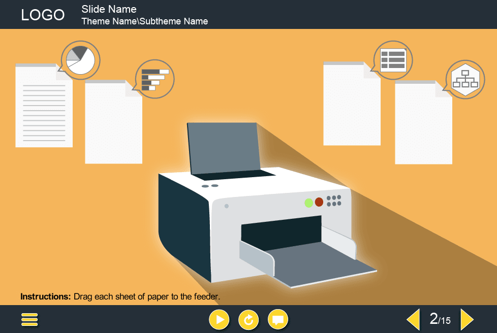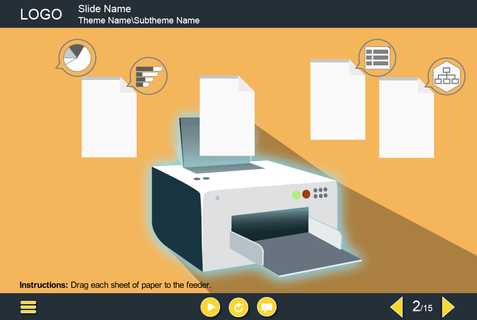 Storyline Drag and Print Documents Template is a ready-to-use template based on Articulate Storyline 2 software. It contains four draggable objects designed as sheets of papers with the wrapped corners. The user should drag each paper to the printer’s sheet feeder to reveal the additional information in popups. This well-designed template allows you to present the course information in a creative way. It would be an excellent addition for your own elearning project. The interaction can be built into any storyline course player. Perfectly runs on both PC and tablet.