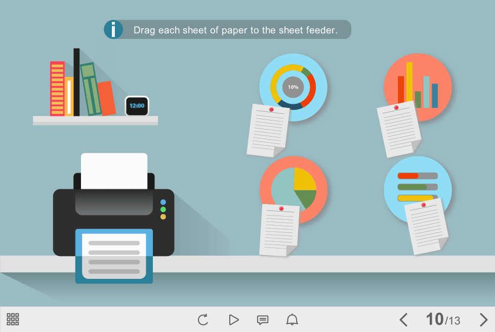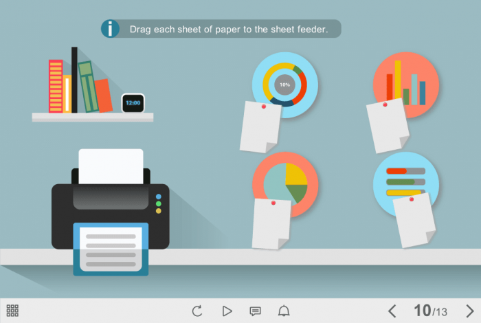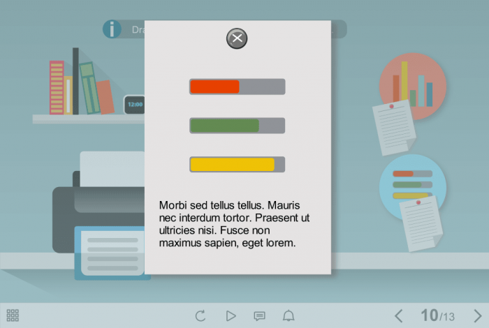 Storyline Dragging Papers To Sheet Feeder Template is a ready-to-use template based on Articulate Storyline 2 software. It contains four draggable objects designed as blank papers pinned on the wall. The user should drag each paper to the printer’s sheet feeder to reveal the additional information in pop-up windows. This well-designed template allows you to present the course information in a creative way. It would be an excellent addition for your own elearning project. The interaction can be built into any storyline course player. Perfectly runs on both PC and tablet.