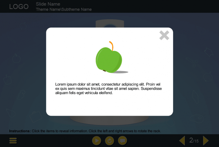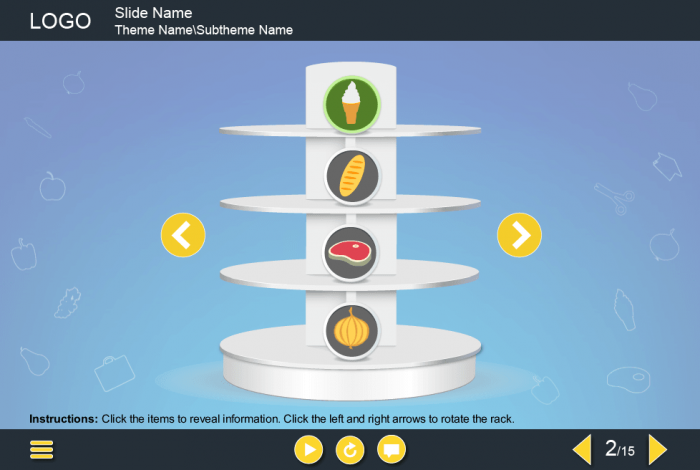 Storyline Rotatable Rack Template. It is a ready-to-use elearning template based on Articulate Storyline 2 software. The interaction represents a four-level rack with clickable icons placed on its shelves. It can be rotated in both directions by clicking on the left and right arrow buttons. The user must click on each icon to reveal the course information in popups. This well-designed storyline template will surely help you to present the course information in a creative way. It can become an excellent addition for your own elearning project. The interaction can be built into any storyline course player. Perfectly runs on both PC and tablet.