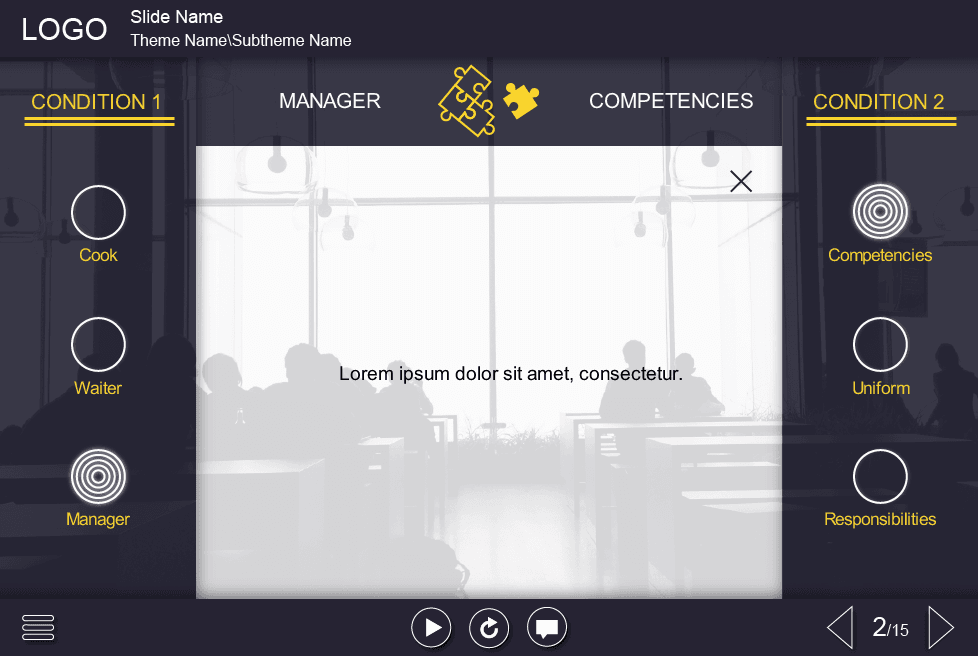 Storyline Selecting The Appropriate Options Template is a ready-to-use elearning template based on Articulate Storyline 2 / 3 software. The downloadable file contains both Storyline 2 and 3 source files. The template contains 3 buttons on the left part of the screen and three buttons on the right. The user is able to select any option from each side, and then he must click on the “Find Out” button to reveal the additional information. This well-designed storyline template will surely help you to present the course information in a creative way. It can become an excellent addition for your own e-learning project. The interaction can be built into any storyline course player. Perfectly runs on both PC and tablet.