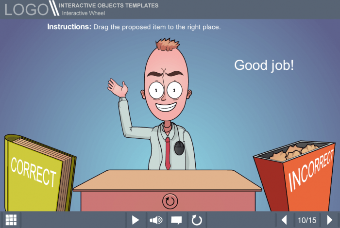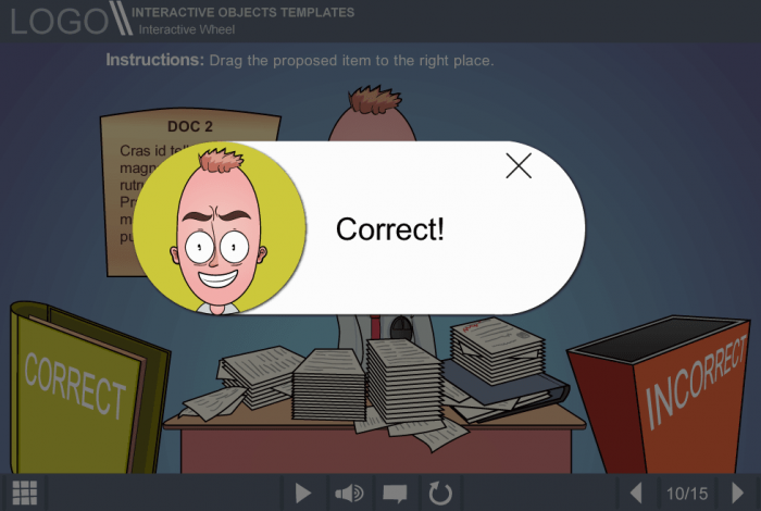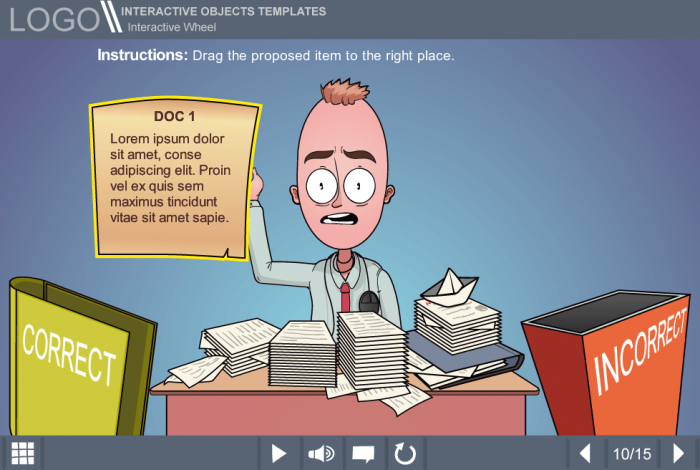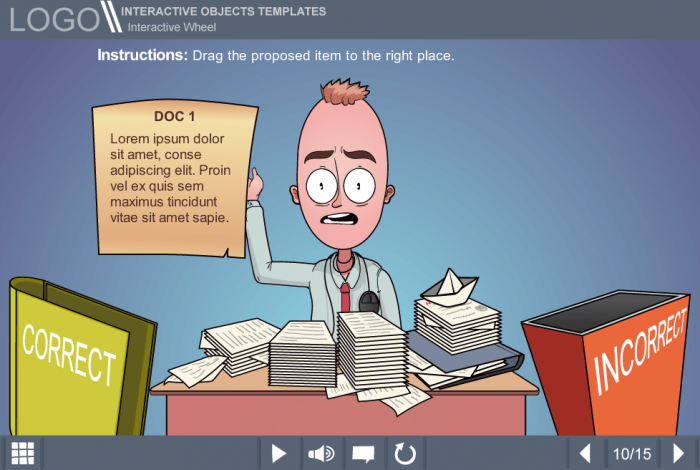 Storyline Making Decisions About Documents Quiz Template. It is an unique template based on Articulate Storyline 2 software. The user must drag each of the proposed documents to the appropriate basket. A puzzled vector man character is used to illustrate the template’s protagonist. After completing the quiz, user gets immediate feedback. It is possible to re-do the quiz in case of the poor results. This template would be an excellent choice to improve learner’s involvement in the educational process and check his knowledge. Compatible with any type of Articulate Storyline Course Player. The Storyline Template is a ready-made product that can be launched on both PC and tablet.