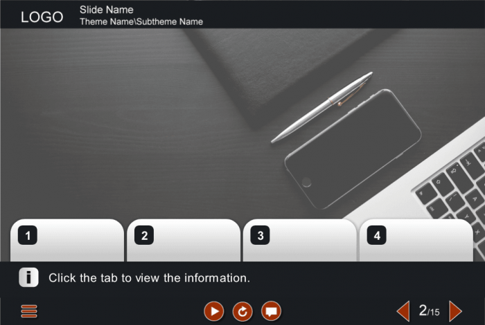 Storyline Sliding Out Tabs Template. A great elearning template can be used to present the course information in an easily perceptible form. The interaction contains 4 tabs placed at the lower part of the screen. The user must click on each tab to reveal the learning materials. The Storyline template is already designed and prepared for usage.