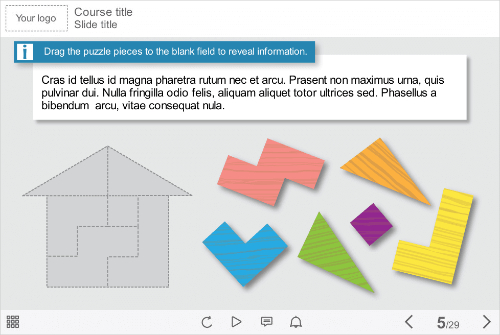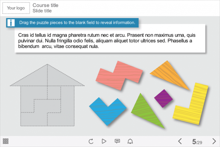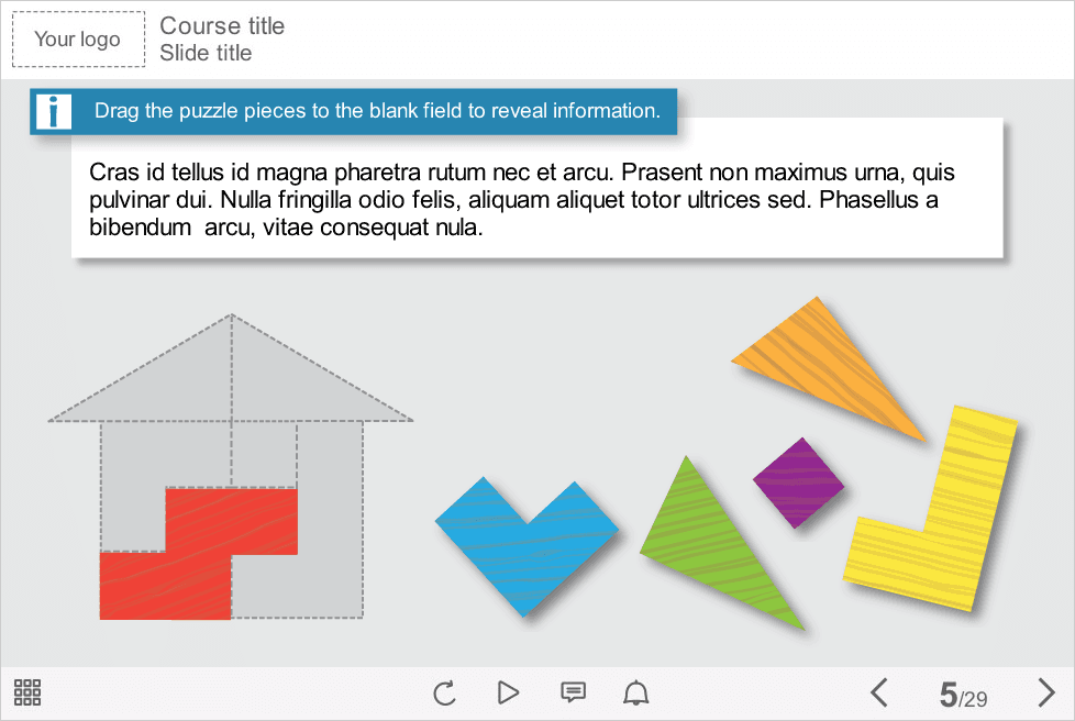 Storyline Puzzle The House Template. A well-designed elearning template would be a great choice to present the course information in a gamified form. The interaction contains 6 draggable objects placed at the right part of the screen. The user must drag them to the proper area to reveal the course materials in pop-ups and to construct the house. Storyline Template is already designed and prepared for usage.
