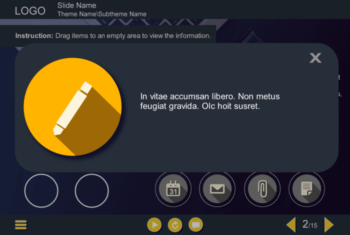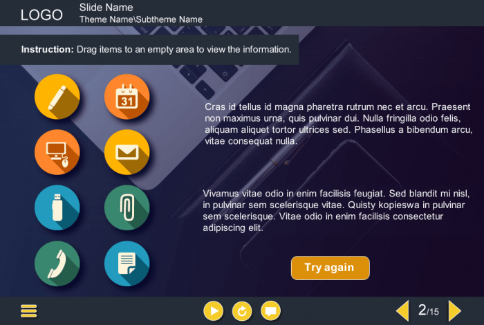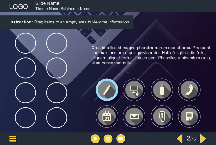 Storyline Dragging Icons Template. A well-designed elearning template would be a great choice to present the course information in a gamified form. The interaction contains 8 draggable icons placed at the right part of the screen. The user must drag them to the empty area to reveal the training materials in pop-ups. It’s possible to review the interaction by clicking on the “Restart” button. Storyline Template is already designed and prepared for usage.