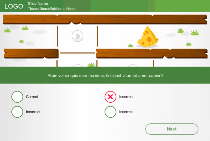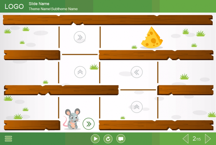 Storyline Mouse Labyrinth Quiz Template. A cute mouse acts as the main character of the interaction. The learner’s task is to help her get to the coveted piece of cheese. A well-designed elearning template can be used for creating powerful training courses. It contains 5 questions with the single choice option. The user must click on the buttons sequentially and give the correct answers to all the questions. The Storyline template is already designed and prepared for usage.