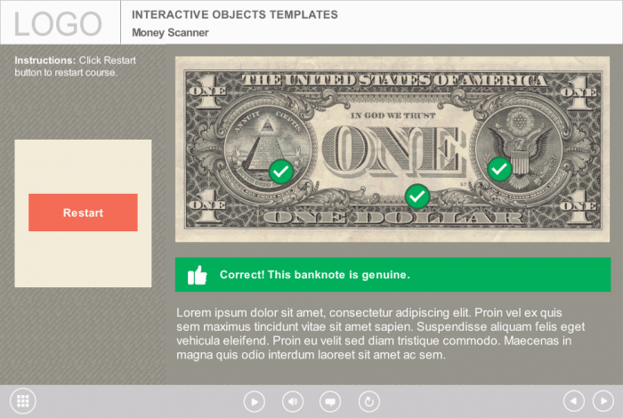 Storyline Authentic One-Dollar Bill Quiz Template. A well-designed elearning template can be used for creating powerful training courses. It contains several slides designed mainly in gray tones. The user must familiarize with the course information by clicking on the markers, and pass the test by dragging the correct answer option to the proper area. It’s possible to restart the quiz in case of an unsuccessful attempt. The Storyline template is already designed and prepared for usage.