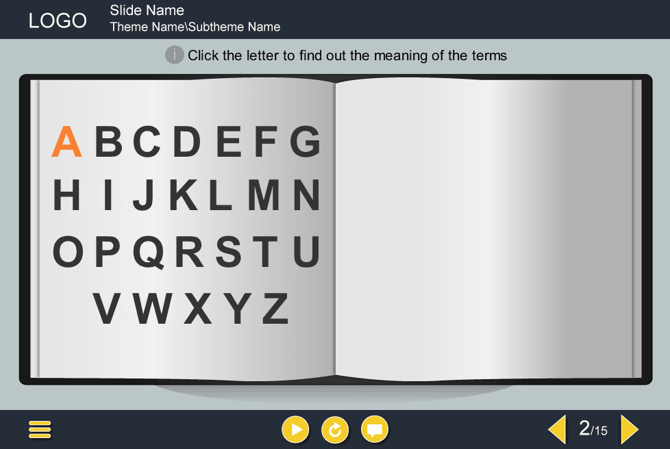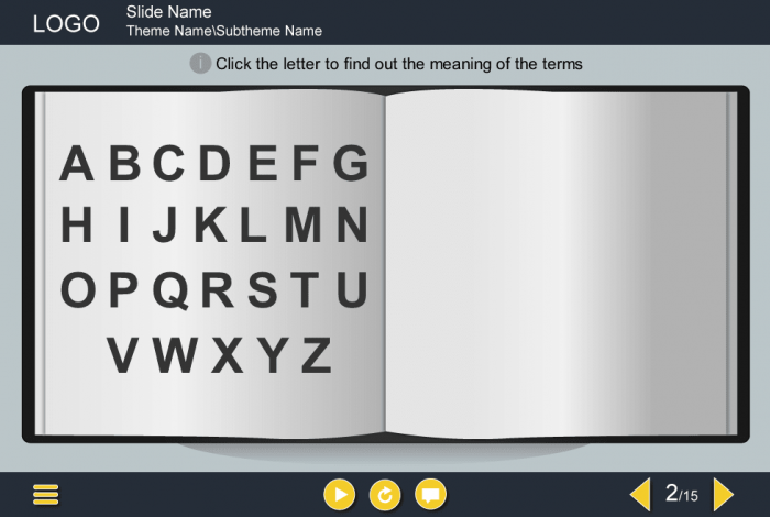 Storyline Glossary Book Template. A well-designed elearning template can be used for creating powerful training courses. It represents an opened book and contains 26 clickable letters placed on a left book’s page. The user must click on each of them to find out the meaming of the terms for which a current letter is the capital letter. The Storyline template is already designed and prepared for usage.