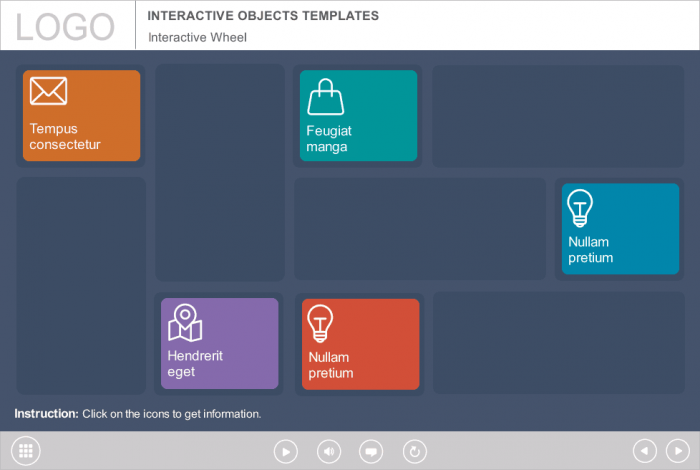 Storyline Colored Buttons With Icons Template. Designed in black and grey colors, this unique elearning interaction will surely help you to present the course information in a creative way. It contains 5 clickable buttons supplemented with simple icons illustrations. The user must click on each button to reveal the learning materials on the same slide. The Storyline Template would be a great choice to create a powerful training course.