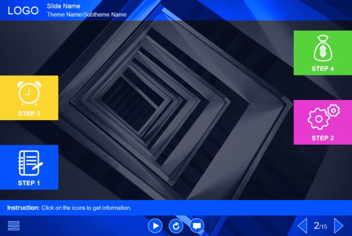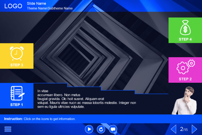 Storyline Steps to Success Template. Designed in black and blue colours, this unique elearning interaction will surely help you to present the course information in a creative way. It contains 4 square buttons with simple icons. The user must click on them sequentially to reveal the learning materials. Cutout photos of a young bearded businessman are used to illustrate a main character of an interaction. The Storyline Template would be a great choice to create a powerful training course.