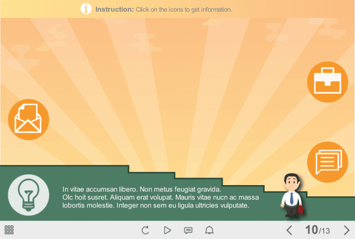 Storyline Climbing Stairs Template. Designed in variegated colors, this unique elearning interaction will surely help you to present the course information in a creative way. It contains 4 clickable buttons designed in the form of orange circles with simple icons. The user must click on them sequentially to reveal the learning materials. The Storyline Template would be a great choice to create a powerful training course.
